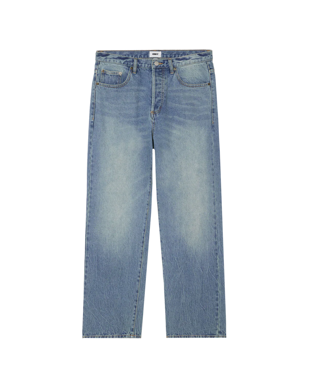 A relaxed fit straight leg with shank button closure with button fly, 5 pocket denim styling and OBEY labeling on back pocket.